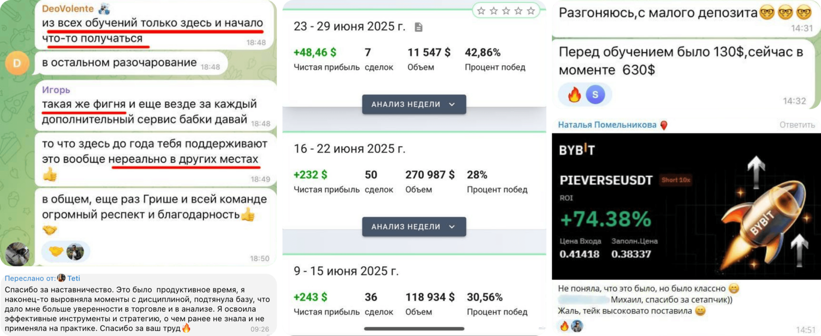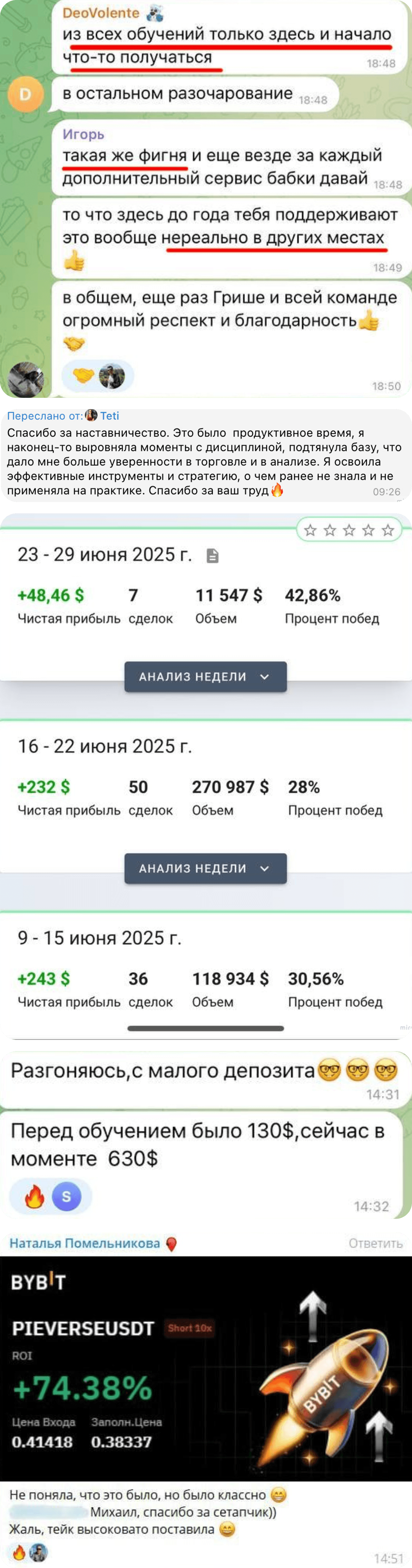 Да. Ментор прикрепляется с первого дня, проверяет задания, разбирает сделки и отвечает на вопросы. Это не курс, где тебя отпускают в рынок — это сопровождение